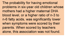 - A higher n-3:n-6 ratio during mid-pregnancy was found to be associated with fewer emotional, but not behavioral, problems in six-year old children.
