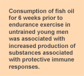 Less well known is the association between regular moderate exercise and immune function. There is accumulating evidence that individuals who exercise regularly have reduced inflammation, a low-grade condition that underlies many chronic diseases, such as obesity, heart disease and type 2 diabetes. Physically fit, active individuals have a lower risk of respiratory tract and viral infections, an important consideration for older adults. Omega-3 fatty acids also reduce inflammatory responses and have been evaluated in athletes with asthma. Findings from these studies indicated that fish oil supplementation in competitive athletes with asthma was associated with improved lung function and less use of bronchodilators. But what happens in non-athletes, the rest of us? A recent study wanted to find out if taking fish oil or long-chain omega-3s affected selected immune responses after exercise in young, healthy individuals who were not trained athletes. In this study, the participating men consumed 1.6 g/day of EPA + DHA for 6 weeks prior to their exercise test. They had been given an exercise test upon entry to the study to determine the appropriate workload for the test. The investigators measured several markers of immune function 3 hours after performing the exercise on a stationary bicycle.