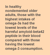 d 75 years of age. They assessed the participants’ consumption of omega-3 and omega-6 fatty acids and measured the concentrations of two abnormal peptides, amyloid-beta40 and amyloid-beta42, characteristic of Alzheimer’s disease. They observed that those with the highest intakes of omega-3 fatty acids had the lowest levels of both amyloid-beta proteins. When they took into consideration other possible confounding variables, only the amyloid-beta42 peptide decreased as omega-3 intakes increased. This peptide is believed to be the more harmful of the two. These observations, if confirmed by others, suggest that higher intakes of omega-3 fatty acids might reduce the production of the most damaging type of beta-amyloid protein. However, because this study describes an association, it cannot show that omega-3 consumption caused the reduced amyloid-beta42 production. It is noteworthy that these abnormal proteins were present in the blood of patients who had no other symptoms of Alzheimer’s disease.