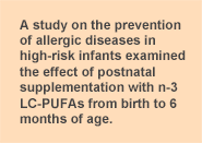 These studies have reported lower sensitization to egg and lower atopic eczema at 12 months, but no reduction in IgE-associated allergies in high-risk infants. In another study, maternal n-3 LC-PUFA supplementation in pregnancy